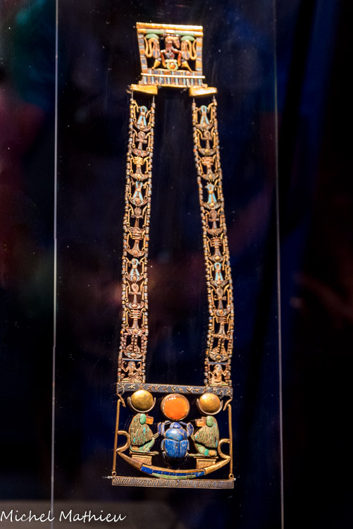 Le fermoir du bracelet montre un scarabée, l’animal associé à Khépri, le dieu-soleil de l’aube et symbole de renaissance.