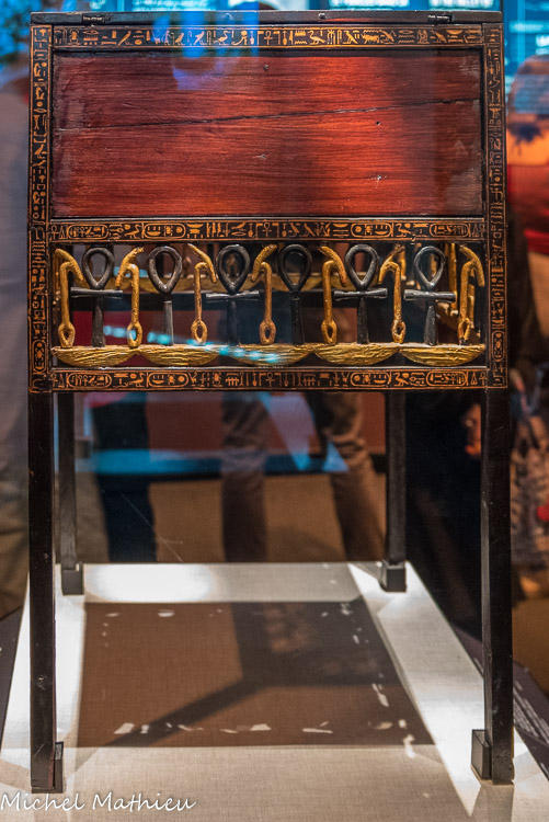 Cet élégant coffre est fait en cèdre du Liban et en ébène. Les arts étaient florissants sous le règne de Toutânkhamon, tout comme sous celui de son père, le roi Akhénaton, qui provoqua d'importants troubles en Égypte en bannissant le traditionnel panthéon des dieux pour n'adorer que le disque solaire, ou Aton.